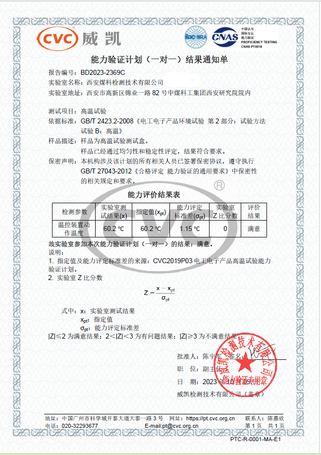 近日,西安研究院检测公司顺利通过由中国合格评定国家认可委员会(CNAS)组织的电气类产品试验能力验证计划,获得“满意”评价结果。