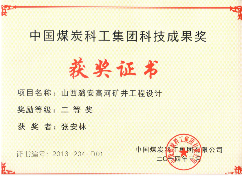 作为项目负责人主持设计的山西潞安集团、亚美大陆煤炭公司中外合作高河矿井设计生产能力6.00Mt/a,2011年6月首采工作面开始联合试运转。是国内当时设计较早的现代化大型井工矿,设计树立高起点,注重结合地质、资源等实际情况,追求系统简单、实用、顺畅,设备搭配合理、可靠,使设计达到了国际同期同领域的先进水平。矿井荣获2012-2013年度中国建设工程鲁班奖及煤炭行业优秀工程设计一等奖。