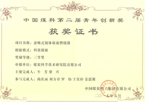 3.逆喷式钝体旋流煤粉燃烧器,中国煤科第二届青年创新优秀奖,2017年,排名第1。