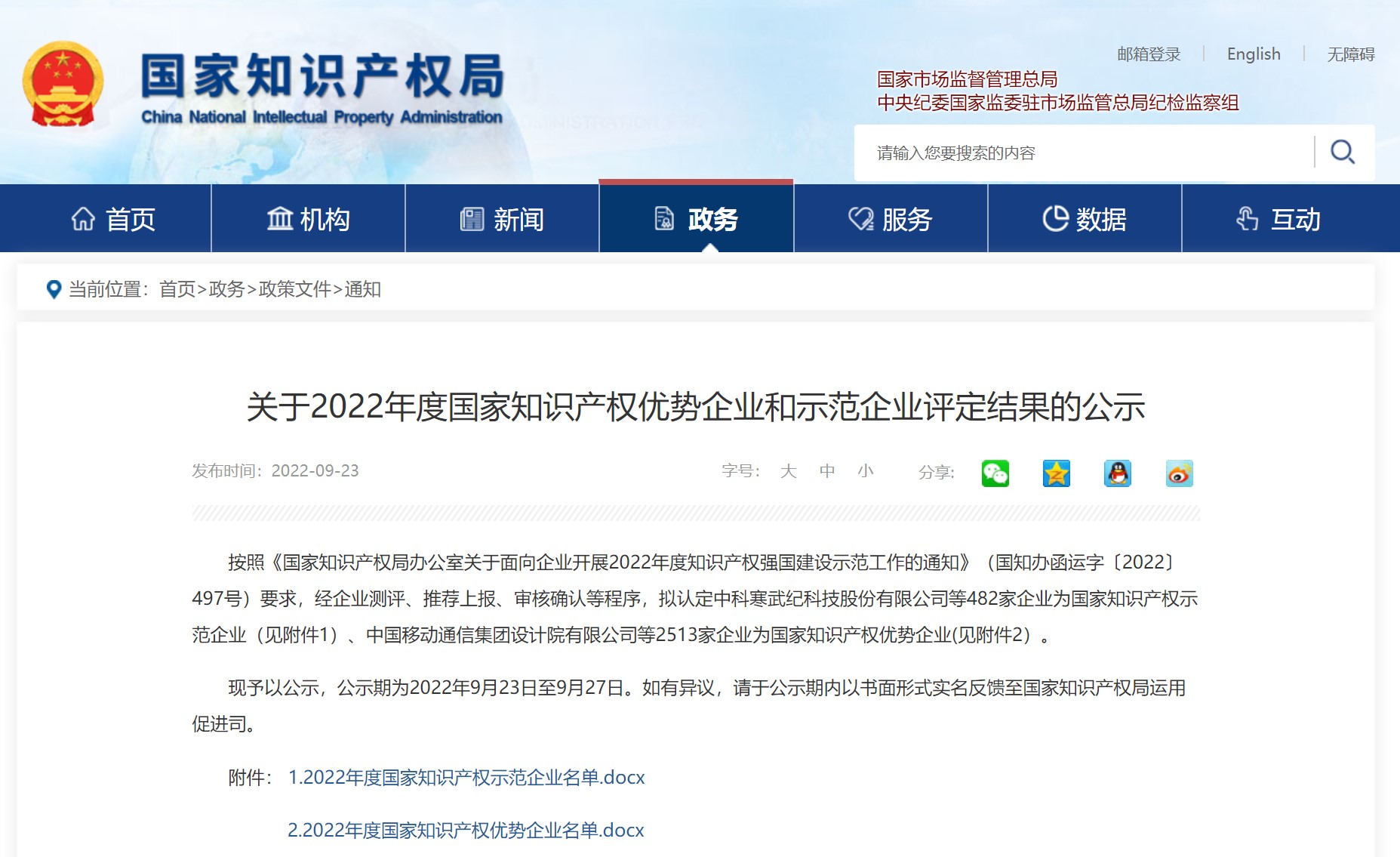 近日,国家知识产权局公示了2022年度国家知识产权优势企业和示范企业名单,天地融创成功入选“国家知识产权优势企业”。