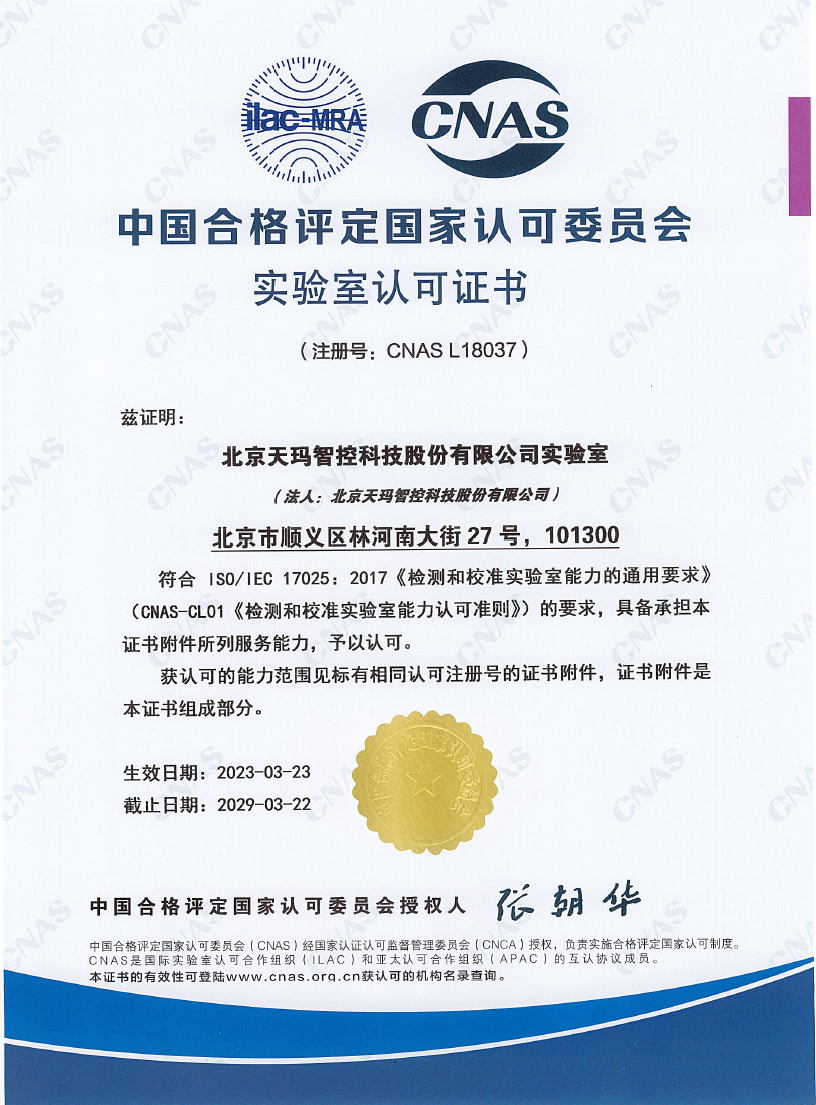 天玛智控实验室取得中国合格评定国家认可委员会(CNAS)认证
