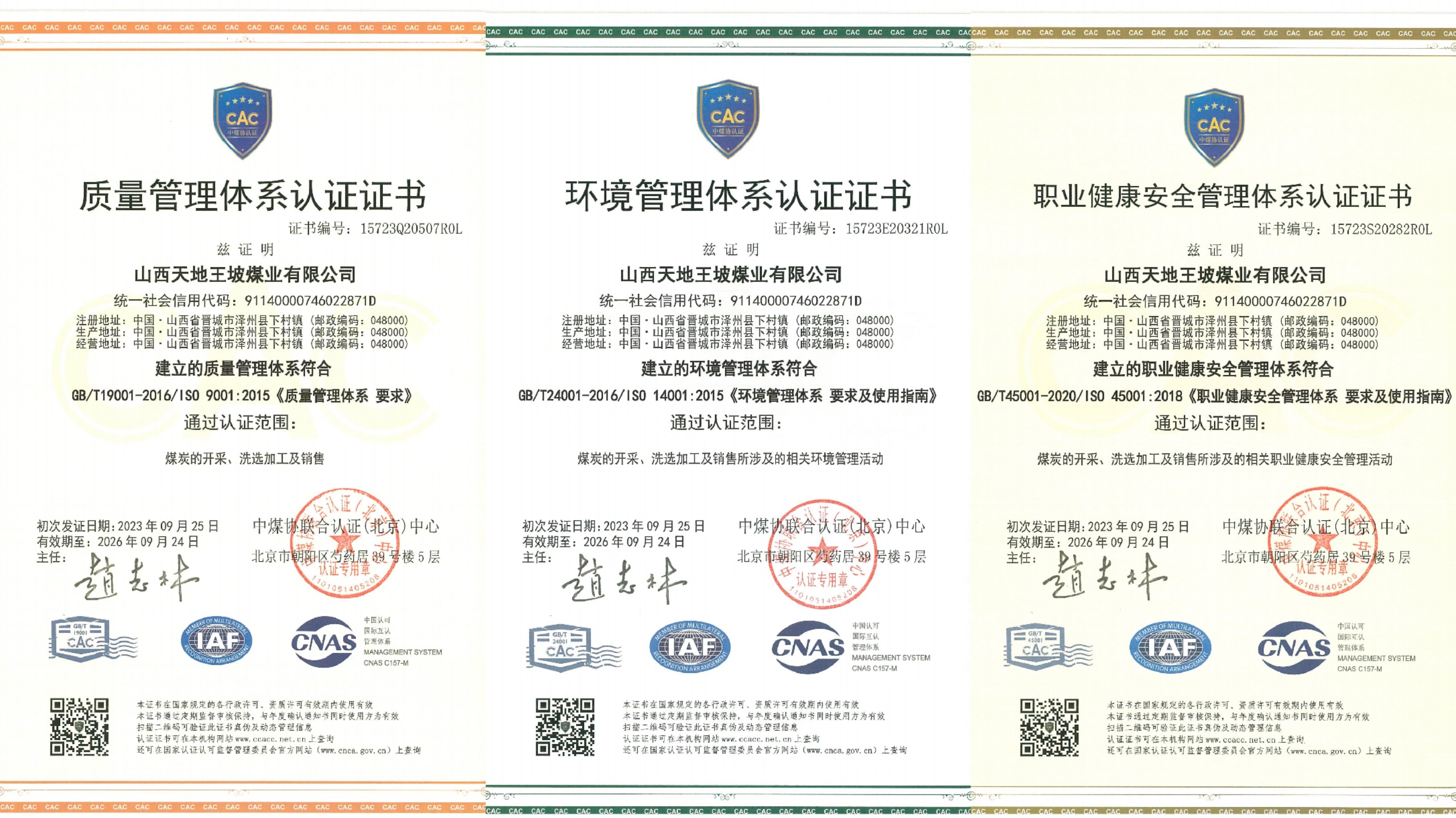 近日,天地王坡顺利通过了ISO9001质量管理体系、ISO14001环境管理体系、ISO45001职业健康安全管理体系认证(以下简称“ISO三体系”),并取得了认证证书,标志着天地王坡在精细化、制度化、规范化、专业化管理方面迈上了新台阶。